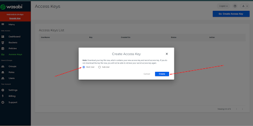 <figure><img src="https://756612007-files.gitbook.io/~/files/v0/b/gitbook-x-prod.appspot.com/o/spaces%2FfAZK2jZ3mL4ir3caZa0b%2Fuploads%2FCIvhuLtRwP90waEABXNx%2Fwasabi_create_access.png?alt=media&#x26;token=4bb5994b-4a49-4cda-adcb-035a0425c812" alt=""><figcaption></figcaption></figure>
