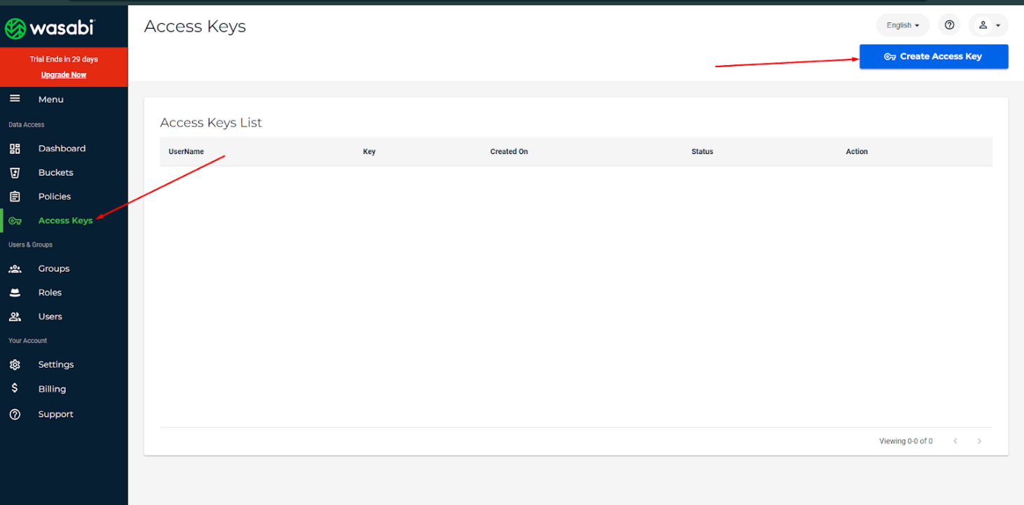 1. Go to your Wasabi Console, select ‘**Access Keys**’ from the left menu, and click on '**Create New Access Key'** to generate a new access and secret key pair.\ <br>