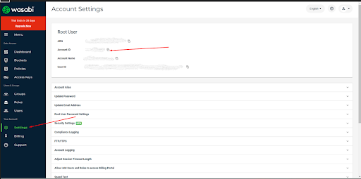4. Click on settings and copy the account ID as shown in the image below. Add this account ID in <mark style="color:red;">**WASABI\_USERID**</mark> in the form field.\ <br>