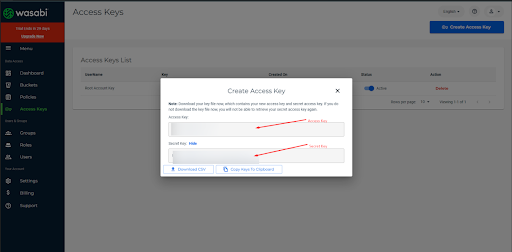 3. Thereafter, download the CSV file and store it safely for future reference. Now, you can add the access key and secret access key to your environment file, which is obtained from the below method or from the CSV file you downloaded and add in <mark style="color:red;">**WASABI\_SECRET\_ACCESS\_KEY, WASABI\_ACCESS\_KEY**</mark> in the form field.\ <br>