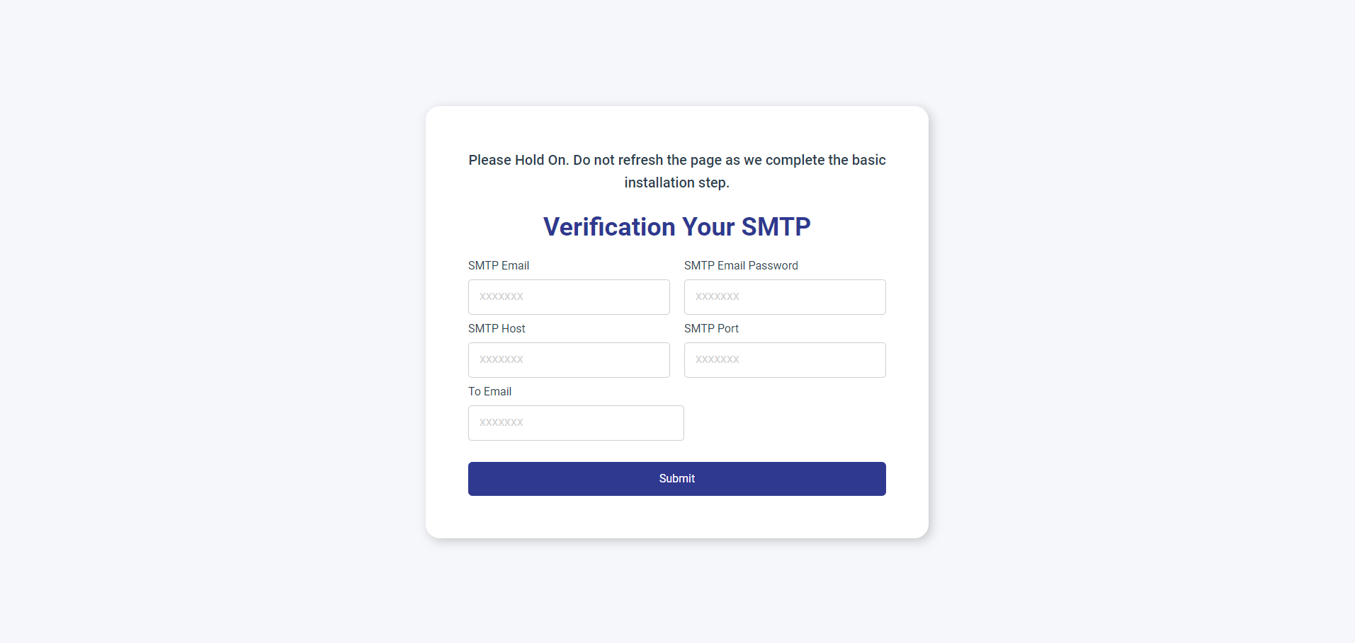 After submitting the SMTP configurations an OTP mail is sent to the TO_EMAIL. Submit that OTP and on successful verification next step will begin, else you will be redirected to the previous step to change SMTP configurations.