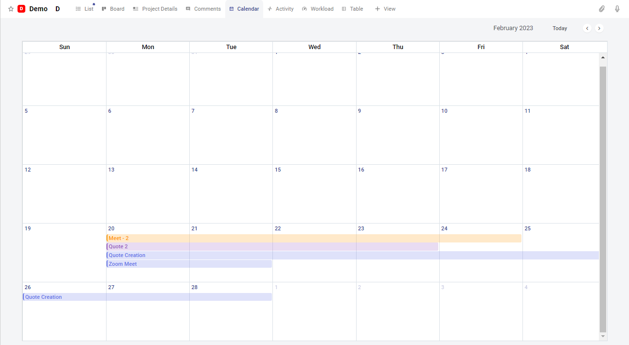 For Example, you need to review task named 'Quote 2' from 20, Feb 2023 to 23, Feb 2023. Then the  days 20, 21, 22 and 23 are highlighted in purple showing status 'In Review'. Likewise, additional tasks are also highlighted. To display tasks in the calendar, you must add the task's Start and End date.